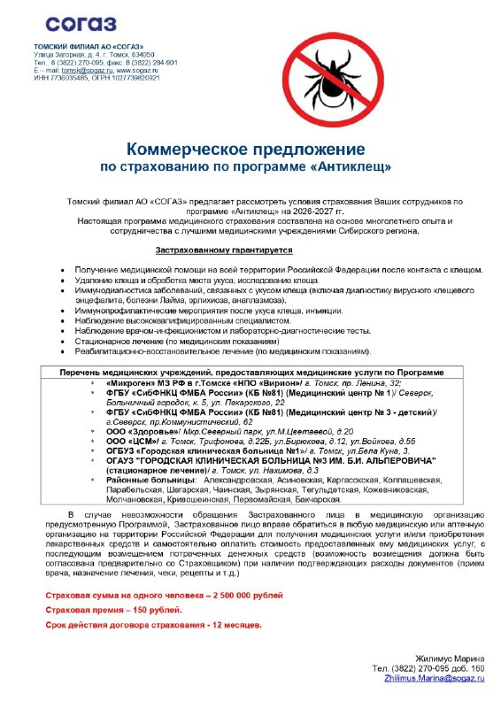 К настоящему письму прилагается памятка, содержащая перечень медицинских учреждений, уполномоченных оказывать помощь по полису, а также форма заявки на страхование.