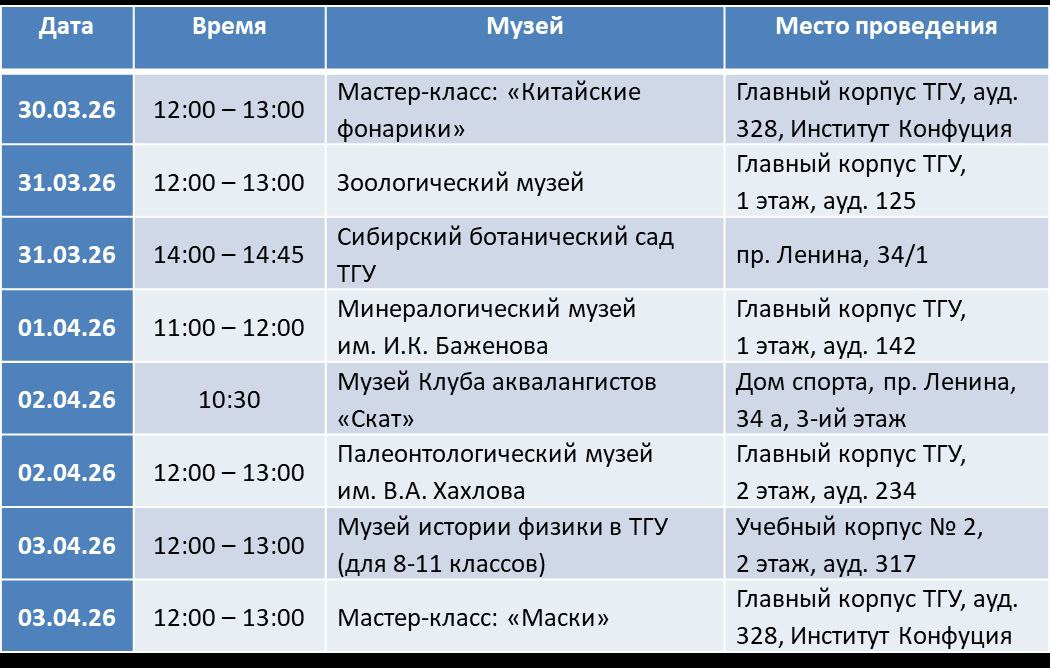 В связи с наличием пропускной системы, группы собираются в холлах тех корпусов, где будет проходить экскурсия (для экскурсий в Главном корпусе сбор в холле Центра культуры ТГУ).